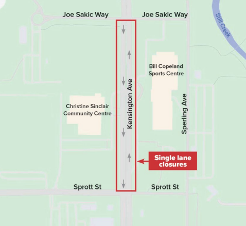 LOCATION: Single lane closures on Kensington Avenue, between Sprott Street and Joe Sakic Way