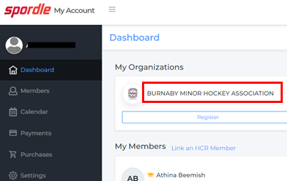 Ensure Burnaby Minor Hockey Association is listed under My Organizations. If it is not, email registrar@burnabyminor.com with your name, date of birth, and HCR number to have it added.